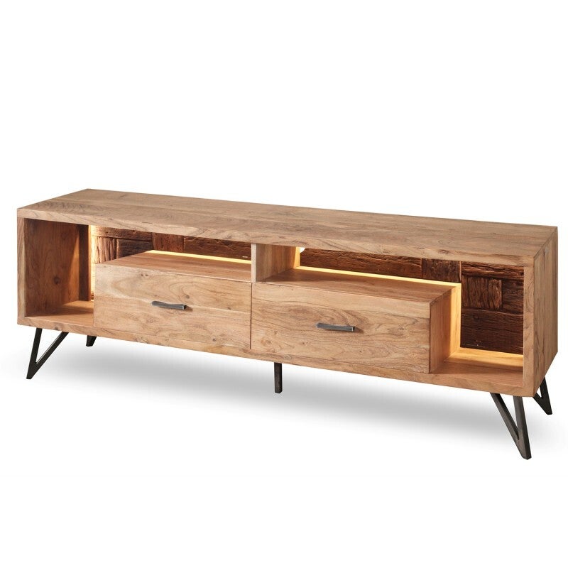 Mueble Tv Madera Acacia C/2 Cajones C/luz, Patas De Hierro 175x40x60cm