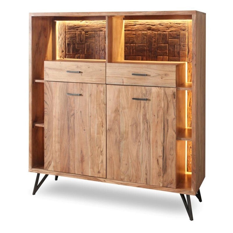 Mesa Entrada Madera Acacia C/2 Cajones+2 Puertas C/luz Led 145x40x150cm, Patas De Hierro