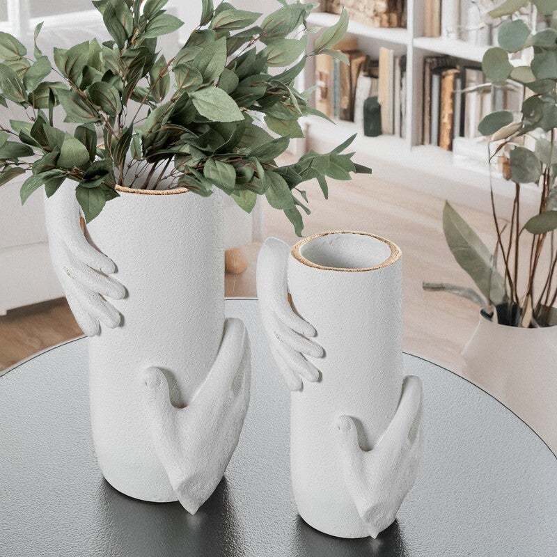 Jarrón Cilindro C/manos 27cm Cerámica Blanco Arena/dorado 17x12x27m