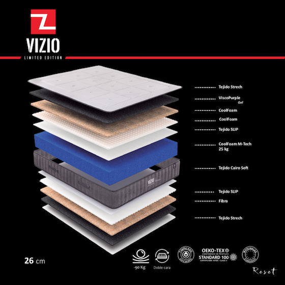 El colchón AVARICIA pertenece a la colección Vizio de la marca Reset. Es el primero de toda la gama. Cuenta con un núcleo de HR CoolFoam M-Tech de 25kg de densidad y una capa de ViscoPurple gel en el acolchado. Con una altura de 26cm, tejido Strech tapa-tapa y a doble cara.